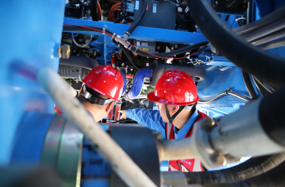 作业人员在对氢燃料电池与锂电池混合动力矿用自卸车电池进行全方位查看(张宇航 摄)