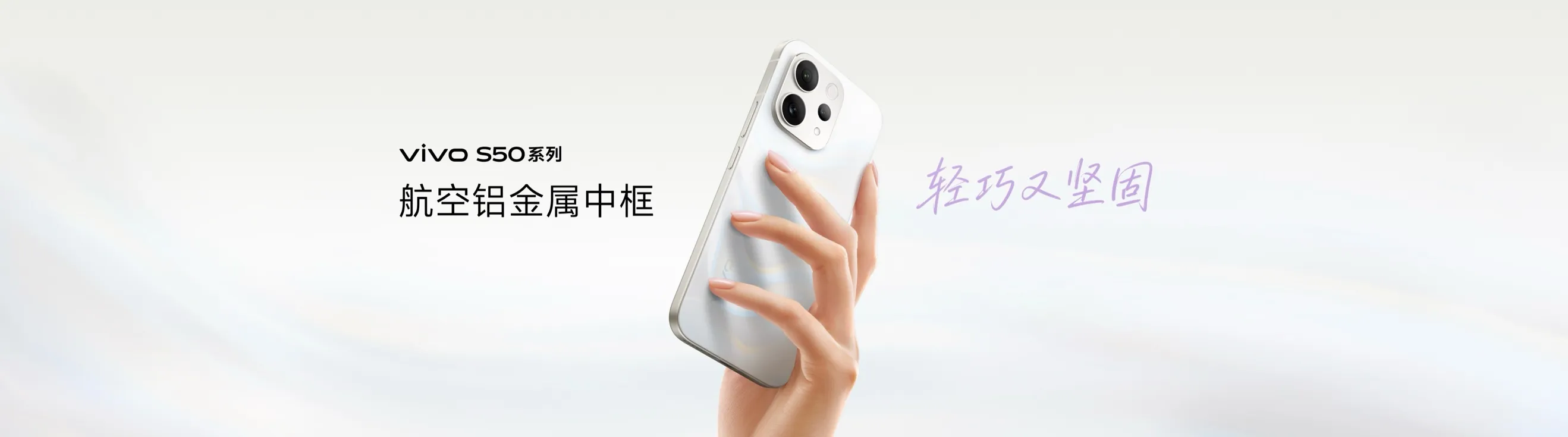 S50系列延续简洁克制又不失细节的设计语言。全系采用航空铝浮空镜组与珠宝级高亮倒角工艺,营造出仿佛悬浮于背板之上的“浮空岛”观感;航空级铝金属中框经 CNC 一体成型与细腻喷砂、阳极氧化等工艺处理,兼顾利落轮廓与细腻手感。同时采用更大 R 角,并在中框与屏幕、背板过渡处加入微弧设计,实现“看着利落、握着柔和”的反差体验。
